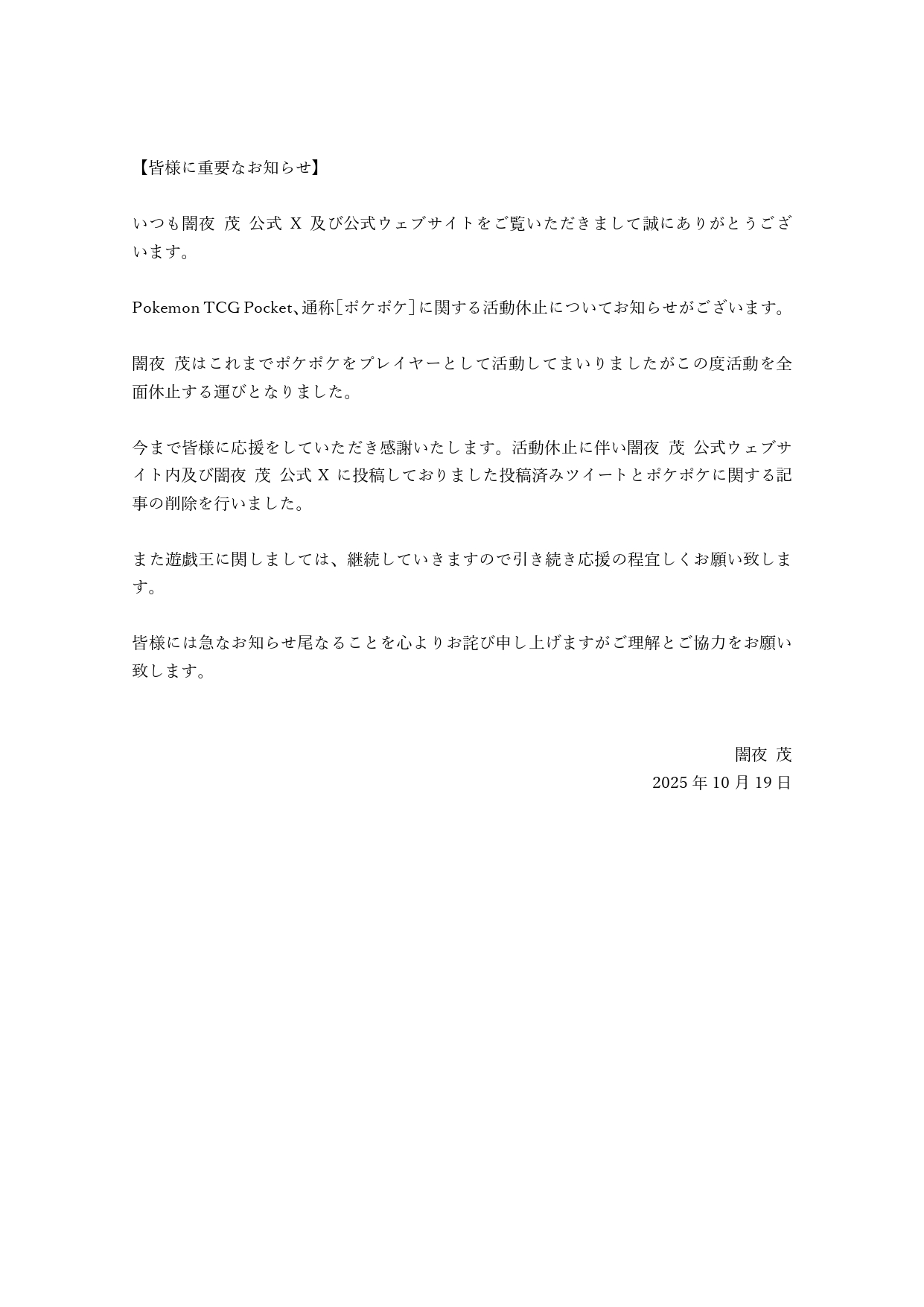 いつも闇夜 茂 公式ウェブサイト及び公式 X をご覧いただき誠にありがとうございます。2025年10月19日にて闇夜 茂から皆様に「重要なお知らせ」と題しましてポケポケプレイヤーとしての全面活動休止について発表されました。